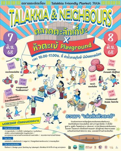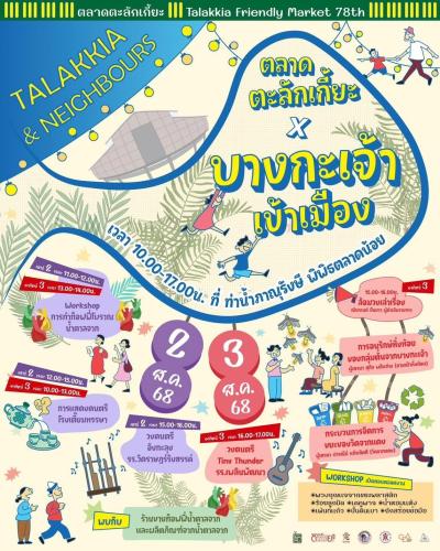 Series ”𝐓𝐚𝐥𝐚𝐤𝐤𝐢𝐚 & 𝐍𝐞𝐢𝐠𝐡𝐛𝐨𝐮𝐫𝐬“ เดือนกันยายนนี้ นำเสนอเรื่องราววัฒนธรรมอันน่าหลงใหลจากชุมชนเจริญกรุง 103 และ กลุ่มมดตะนอย ชุมชนชาวมุสลิมที่จะมาเยือนชาวตะลักเกี้ยะในตีมอันแสนอบอุ่นและน่ารัก “ดอกโบตั๋นบ้านฉัน พระจันทร์เสี้ยวบ้านเธอ” มาร่วมเรียนรู้วัฒนธรรมที่แตกต่างหลากหลาย ผ่านอาหารการกินอันมีเอกลักษณ์เฉพาะที่จะนำมาขายในงานด้วย แอบบอกเมนูคร่าว ๆ ก่อนว่ามีทั้งบริยานีไก่ ข้าวยำปักษ์ใต้ ขนมจีน ทอดมันปลากราย สลัดแขก และของหวานอย่าง ขนมโค โก๋สุ่ย ขนมหัวเราะ ขนมไข่นิ่ม ขนมบะก๊า เตรียมอิ่มอร่อยกันได้เลย !